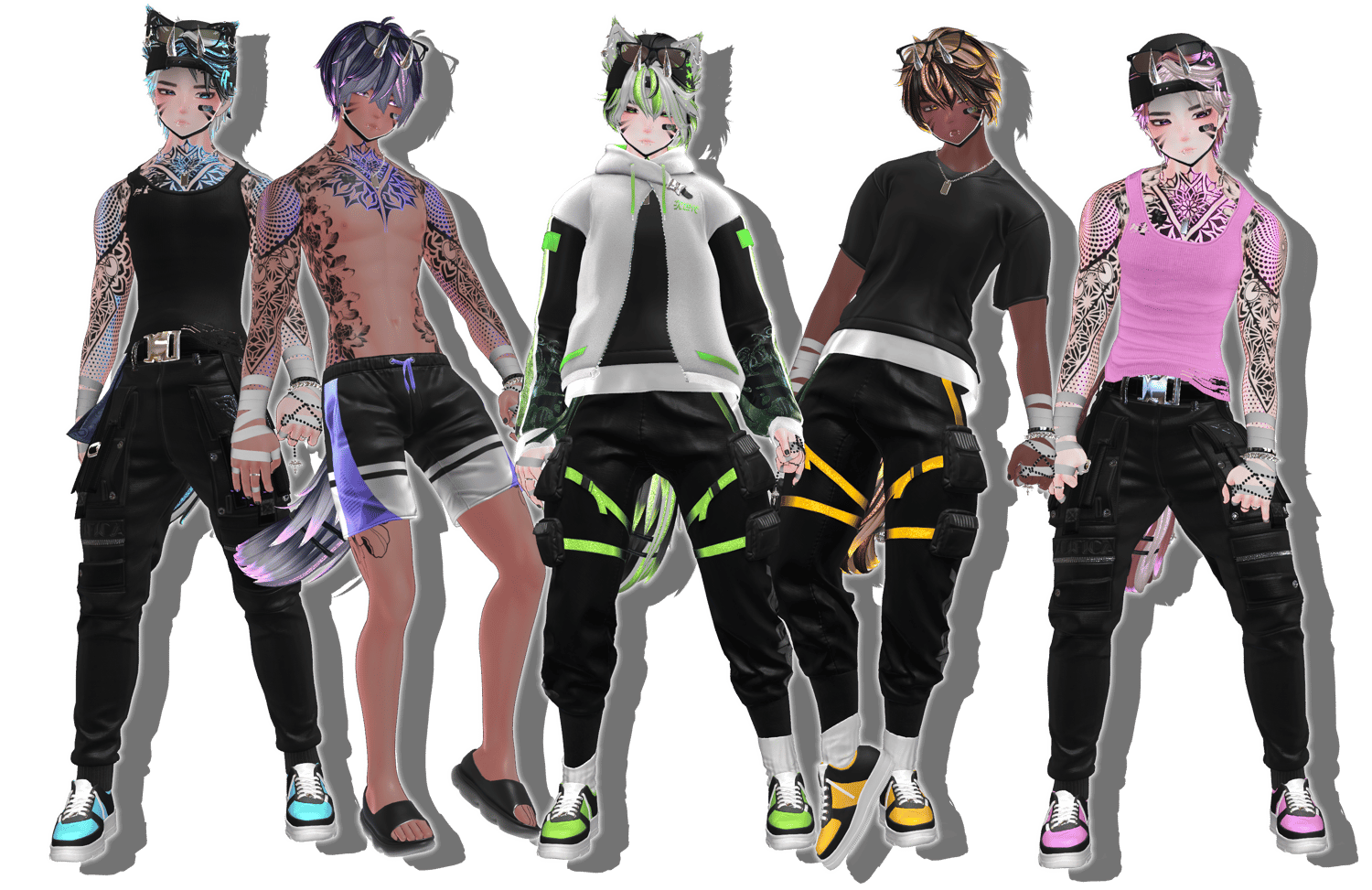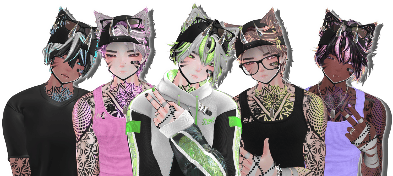 Horns, Baseball Cap, Bandaids w (alphas by Smoluni), Piercings, Mask, Bandages, Jacket, Tshirt, Trunks, Sliders, Nail Textures, Face Markings, Light Palm edits: Whituu