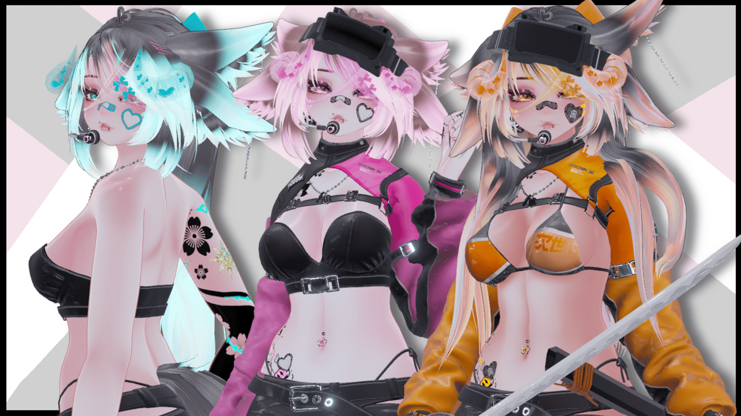 - Bikini Top, Bikini Bottoms, Tank Top, Tech pants, Stompers, Sweat mask, Tattoo Textures, Body Piercings, Figurine Box, Ninja Stars, Katana, Drone fbx, Hand Kunai, Textures for Sadge collection Main outfit not inc. accessories: Whituu